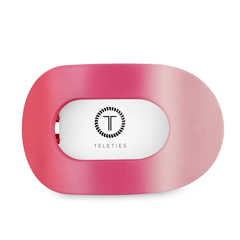 Lay flat and relax with the new TELETIES Kiss & Tell Flat Round Hair Clip in Pink. Hand-sprayed for a one-of-a-kind pink and red ombré—expect slight variations in each clip. This hair clip is designed to allow you to lay back flat, do yoga, or sit comfortably in a seat with a headrest, and it is made with the same material that is nearly unbreakable.