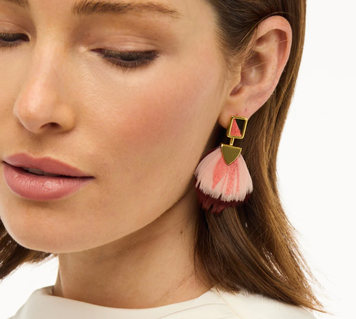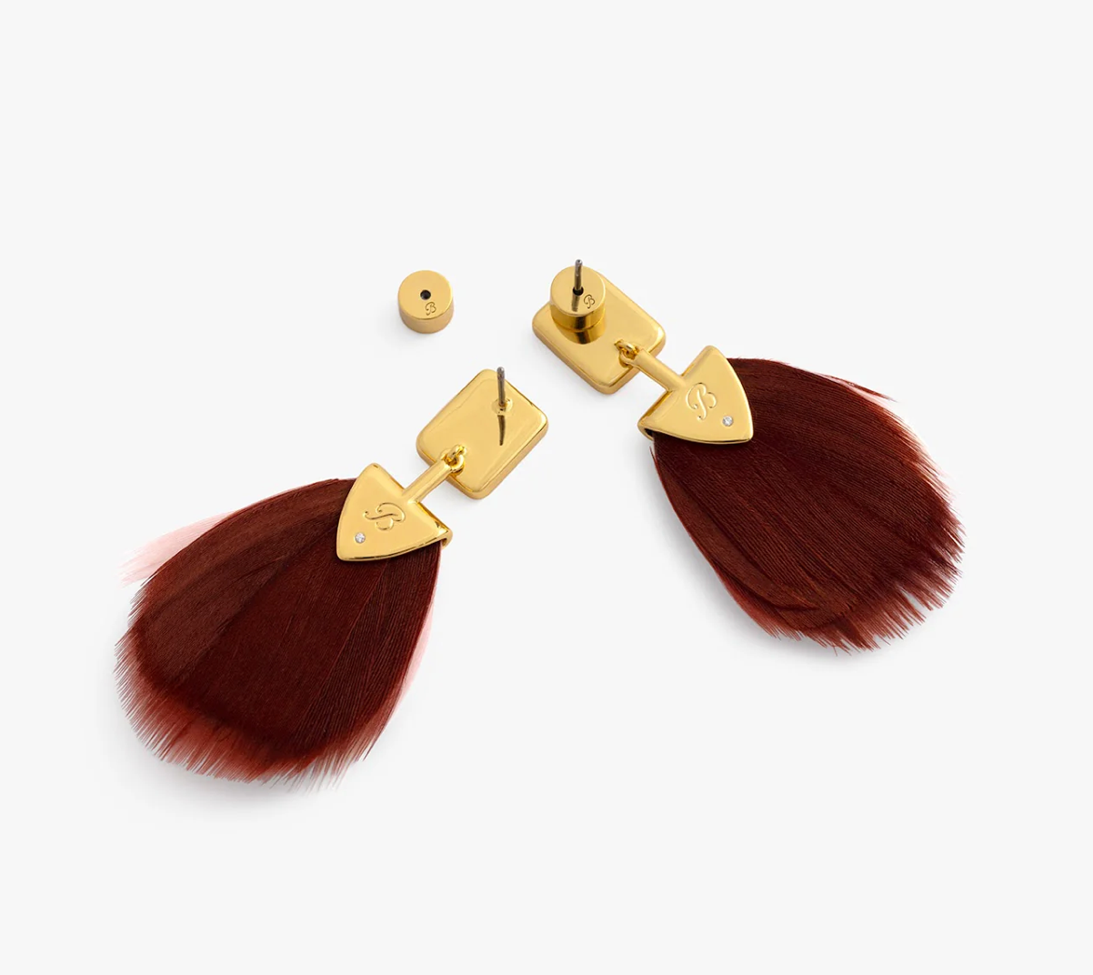The Megan Statement Earring brings a bold yet playful touch to day-to-night dressing. Handcrafted with champagne- and rust–dyed goose feathers, accented by pops of coral peacock sword and grounded with green rooster feathers, the design delivers texture, movement, and just the right amount of flair. Finished in 18kt polished gold plating, Megan adds fluff, color, and unmistakable Brackish charm to any look.