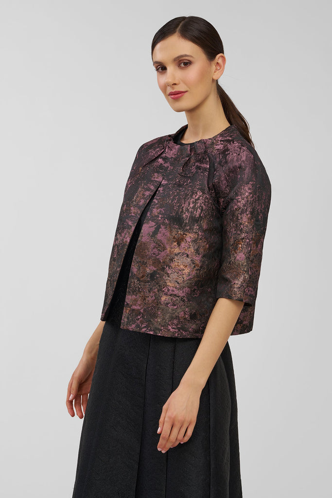 Metallic jacquard cropped jacket with softly pleated neckline and elbow-length sleeves. Finished with a front slit and hook-and-eye closure for a clean, structured fit. Layer it over the matching Charlotte Dress for chilly evening weddings or gallery nights.