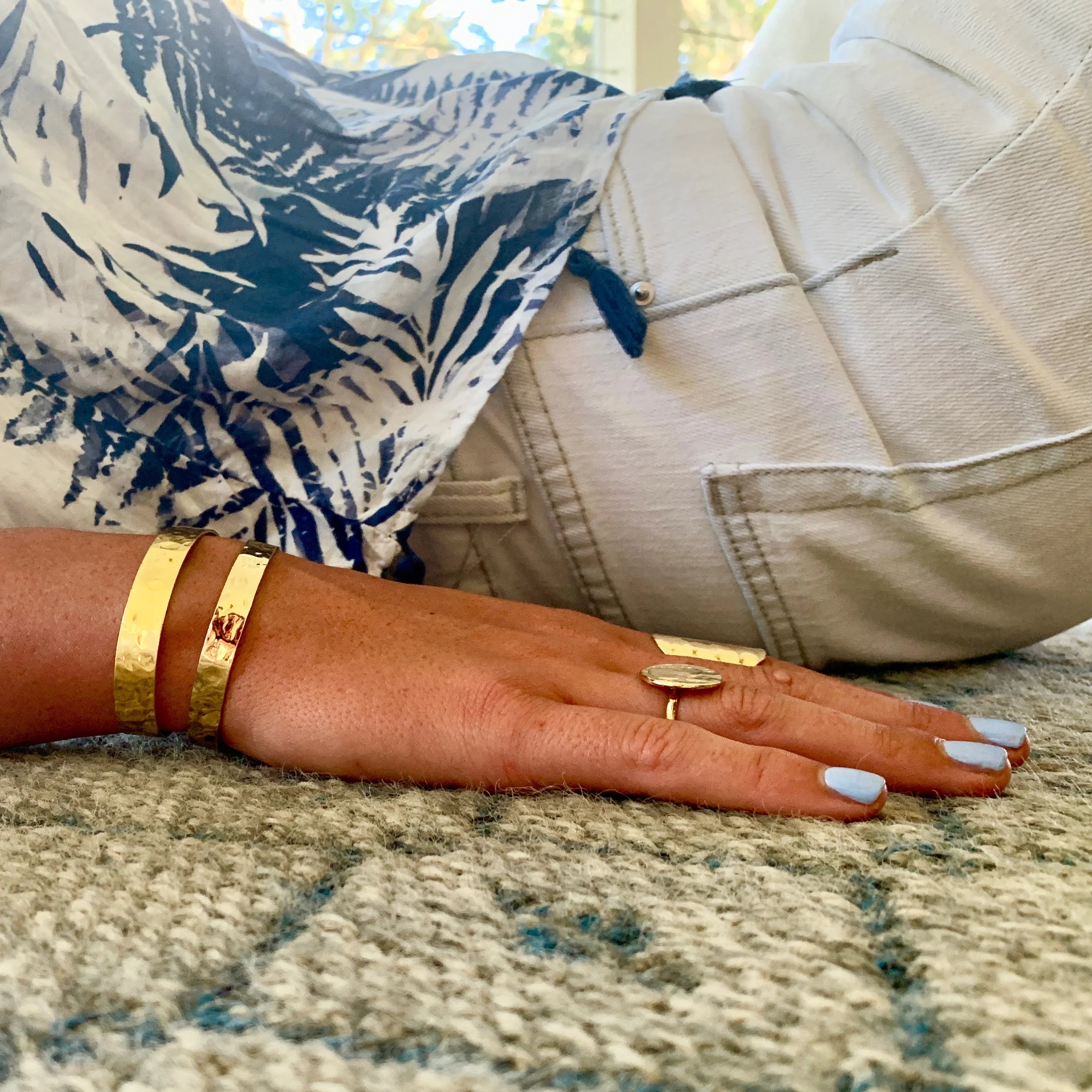 Gorgeous and goes with everything! Heavy 24 karat gold plating over hammered brass and look amazing in a stack!