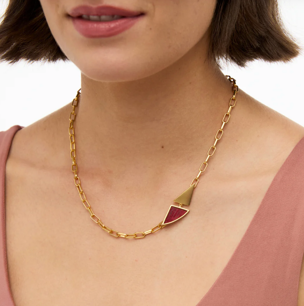 The Aurora Necklace blends refined minimalism with organic texture. Featuring peacock hurl - the fine, iridescent strands near the eye of the feather - this asymmetrical triangle pendant adds subtle shimmer and natural movement to any look. Framed in 18K gold plating, Aurora’s design feels both modern and timeless. Whether worn solo for a hint of elegance or layered with other pieces for added dimension, this necklace brings a touch of nature’s brilliance to your everyday style.