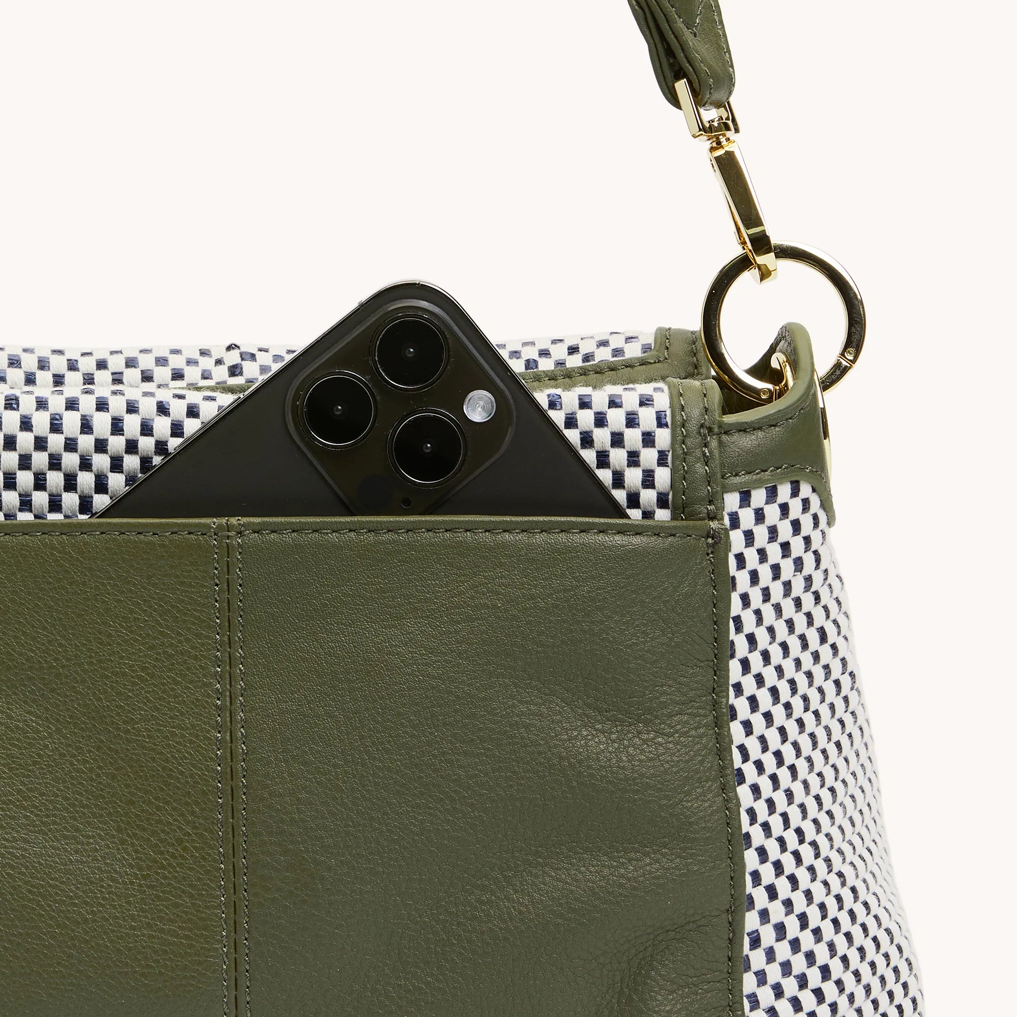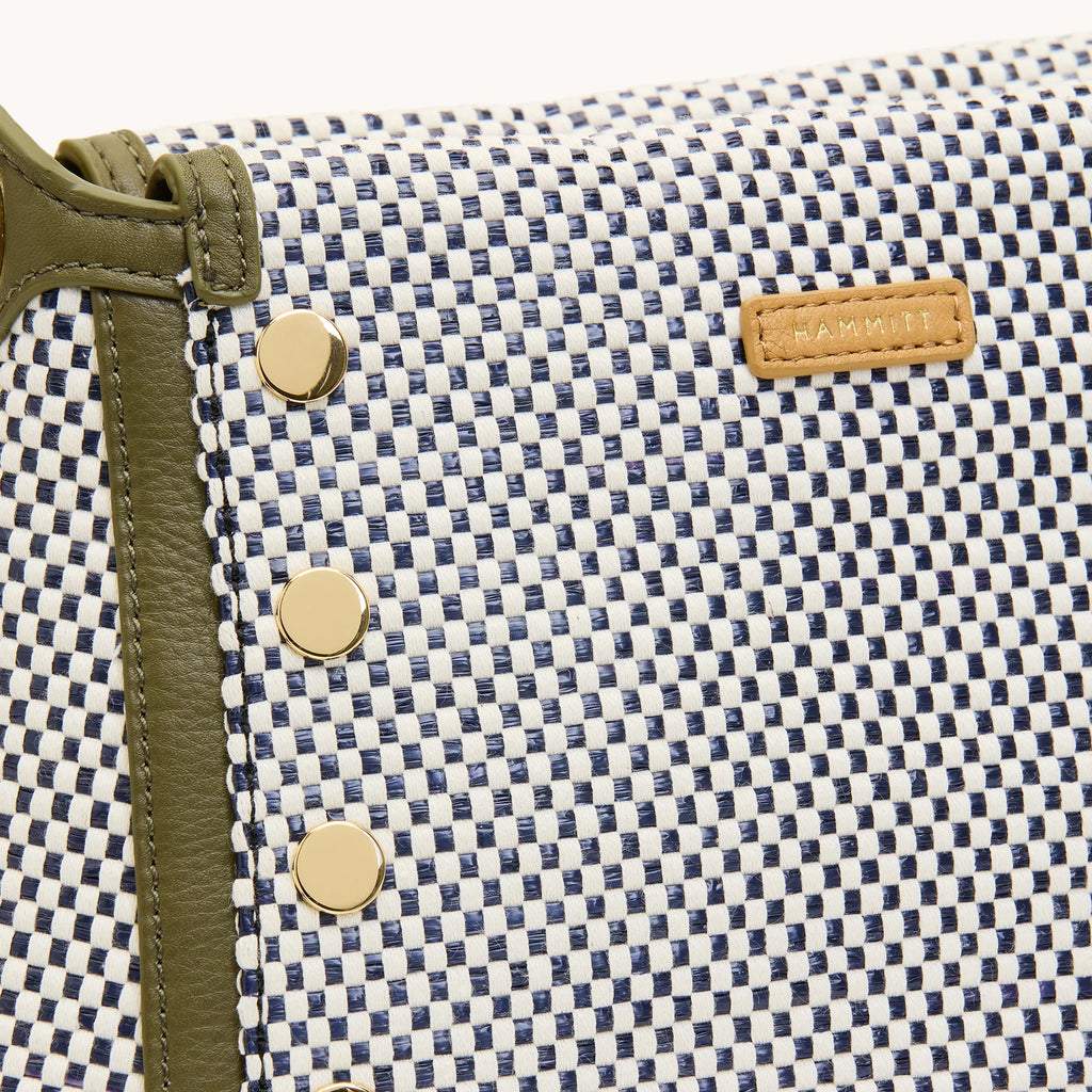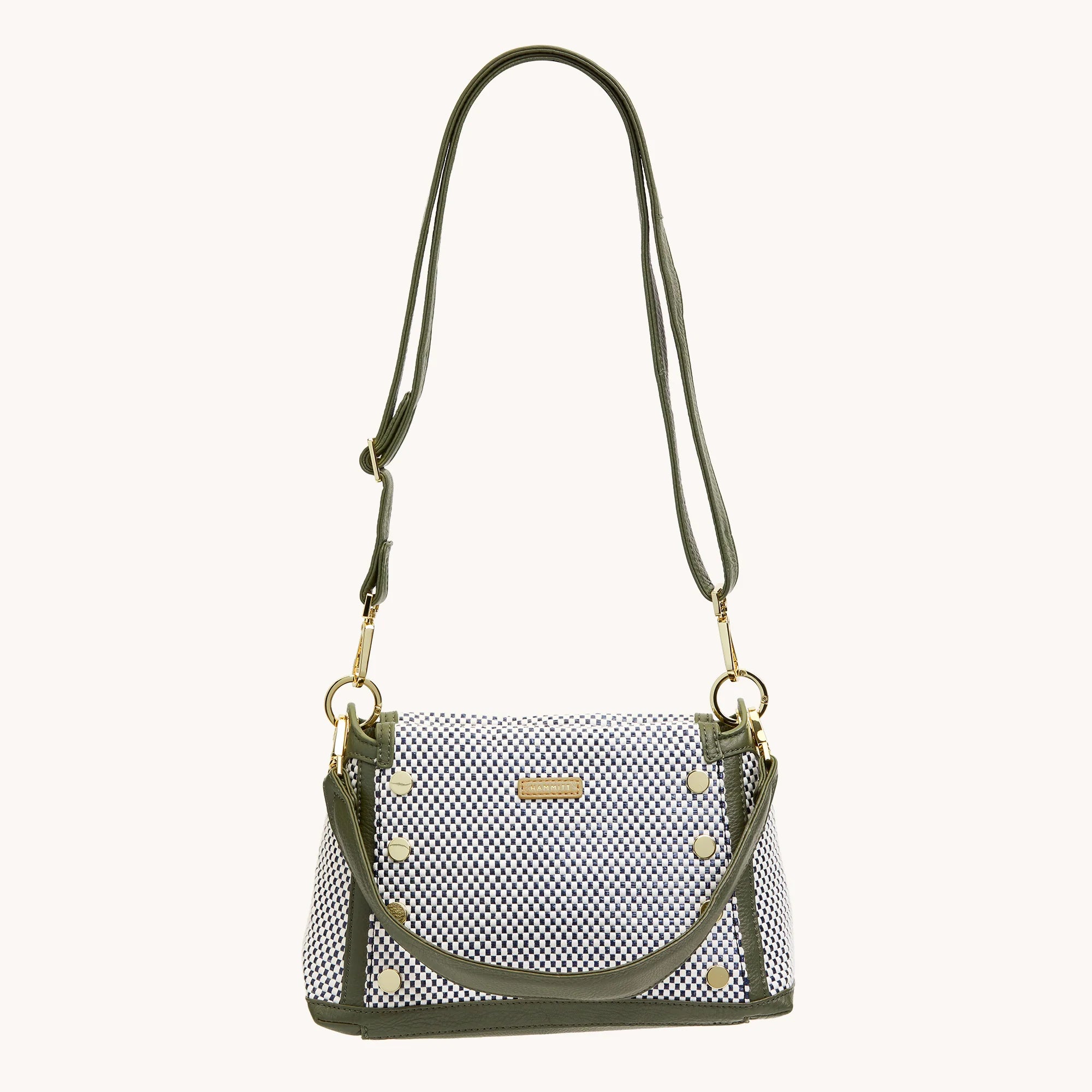 - Crafted with a tight cotton and cord weave of white and deep navy, alongside soft green leather