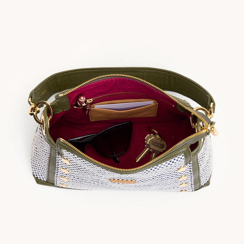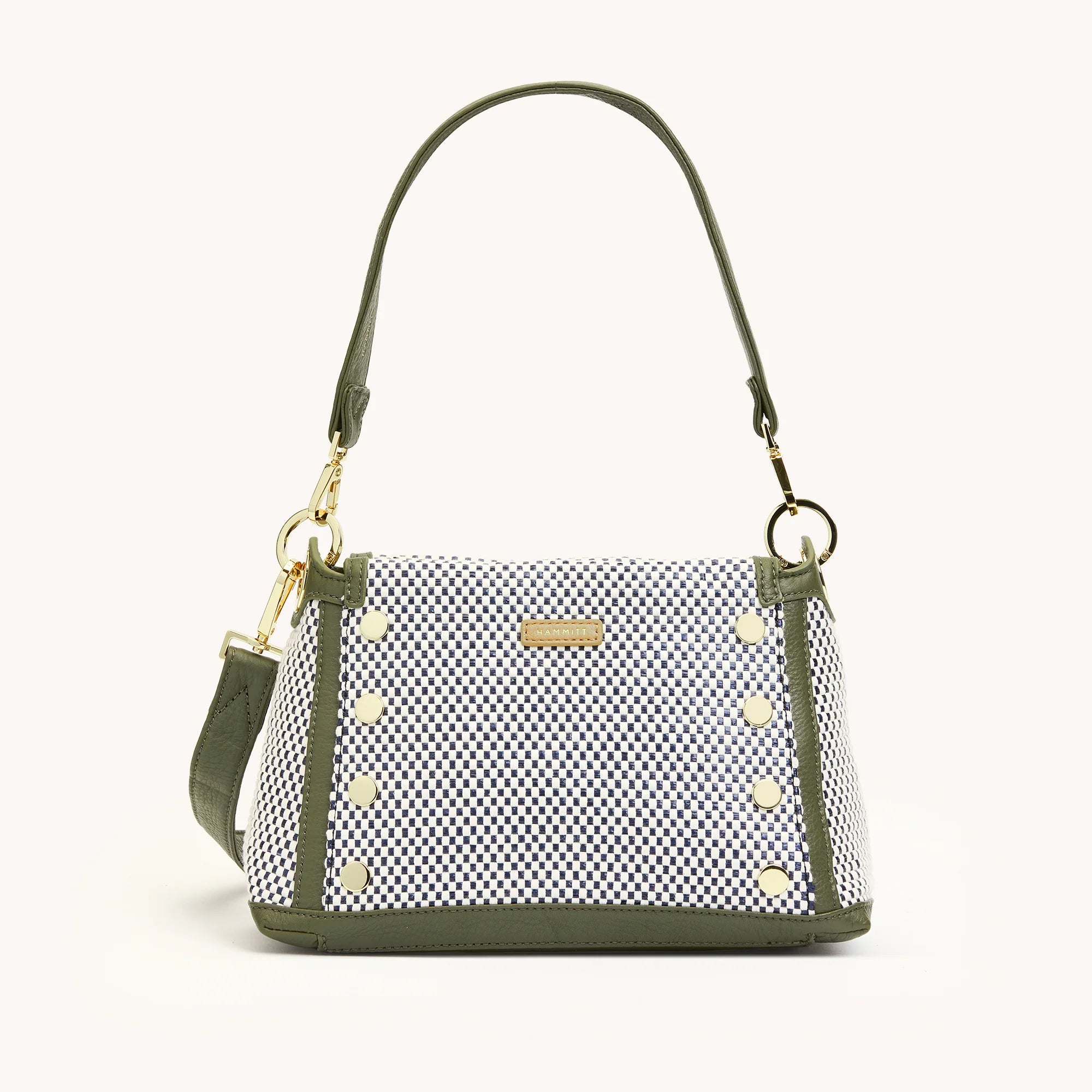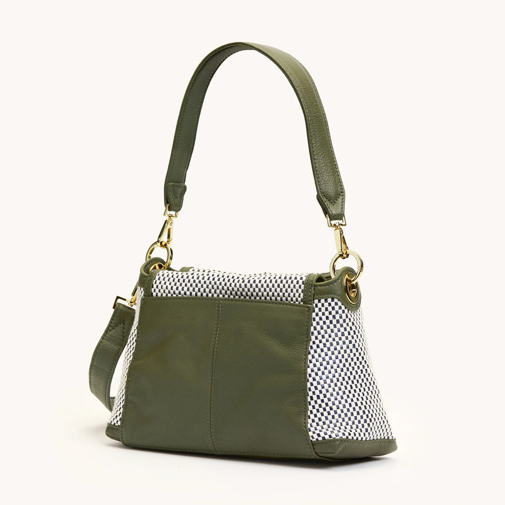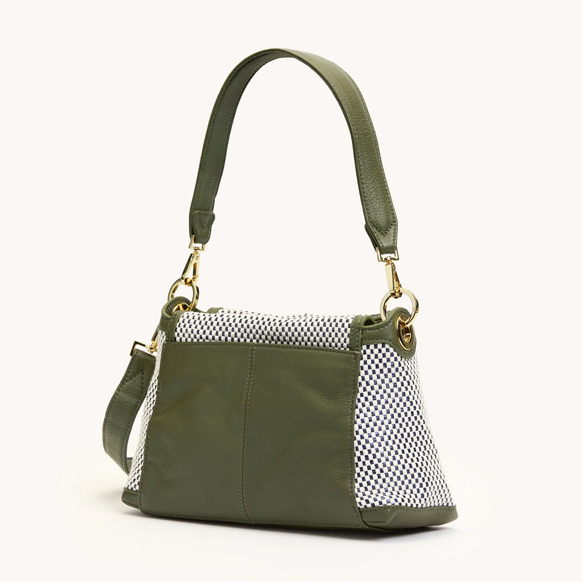 - Crafted with a tight cotton and cord weave of white and deep navy, alongside soft green leather