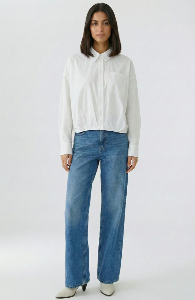 - Boxy cut, cropped length