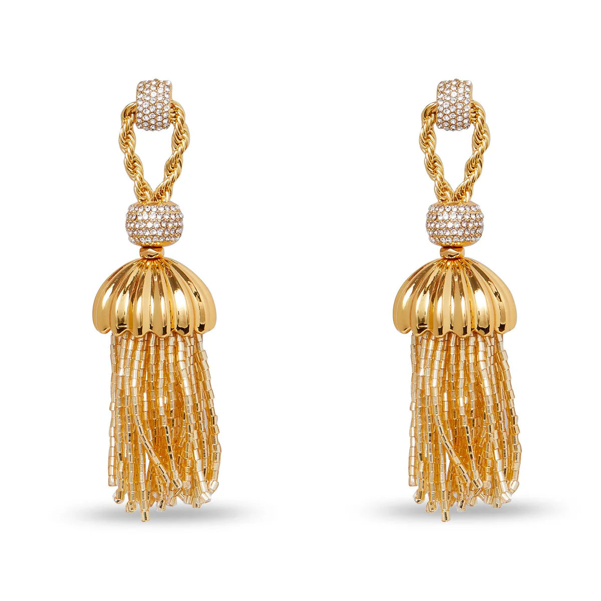∙ Strands of dangling gold glass beaded fringe suspended from a 14K gold-plated scalloped umbrella dangling from a rope casted looped through a pave-studded post