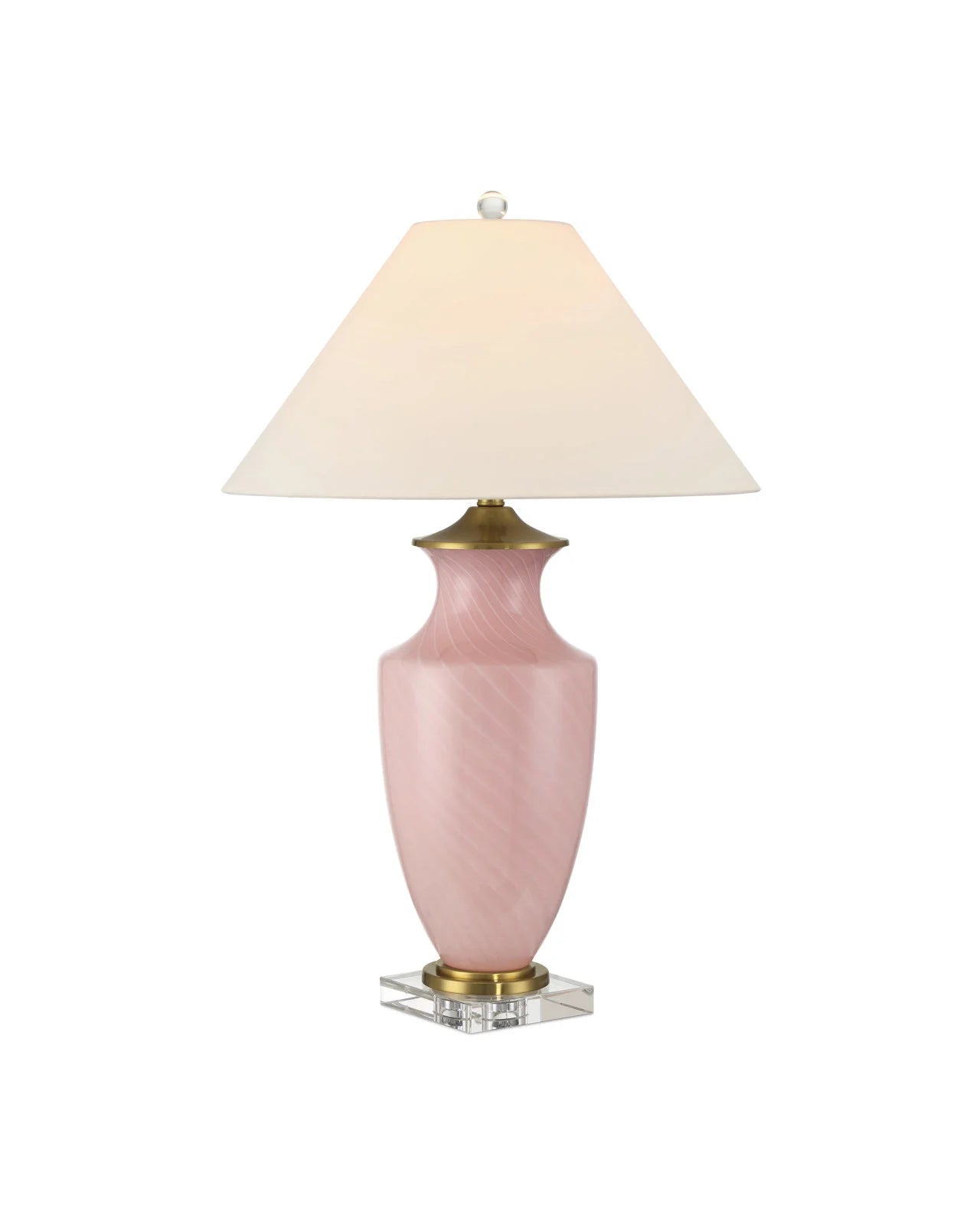 The tone-on-tone pattern flowing along the surface of the baluster-shaped body of the Lucy Pink Table Lamp is made in the Venetian tradition of Zanfirico, which was perfected by Murano glassblowers in the nineteenth century. Rods of glass are heated until they fuse and then pulled to create the markings. The pink lamp is topped with an empire shade and there is a metal step above the optic crystal base in a polished brass finish.