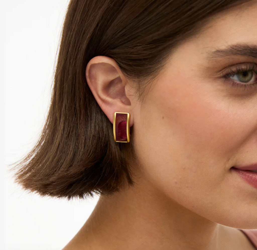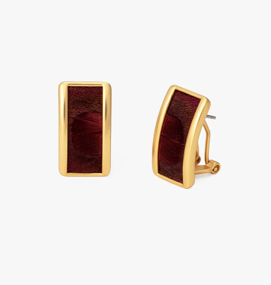 The Myra Frame Stud brings bold elegance to a classic silhouette. Featuring dyed Dark Berry peacock eye feathers in a mirrored layout, this design showcases the feather’s signature iridescence with a deep, jewel-toned twist. Shifting between shades of plum, garnet, and midnight, Myra catches the light with every movement - offering a richly dimensional look that’s equally striking for day or night.
