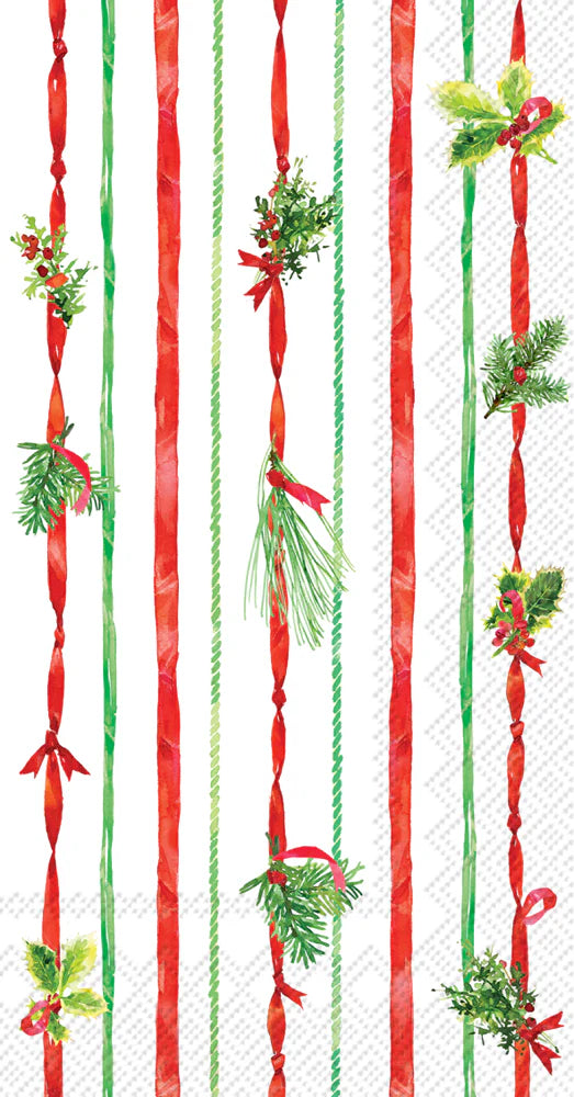 Holiday Festivity Theme. This joyous and vibrant napkin design embodies the celebratory spirit of the holiday season. Adorned with festive red ribbons intertwined with lush green foliage, it brings an air of warmth and cheer to any gathering. Perfect for Christmas celebrations and seasonal parties.