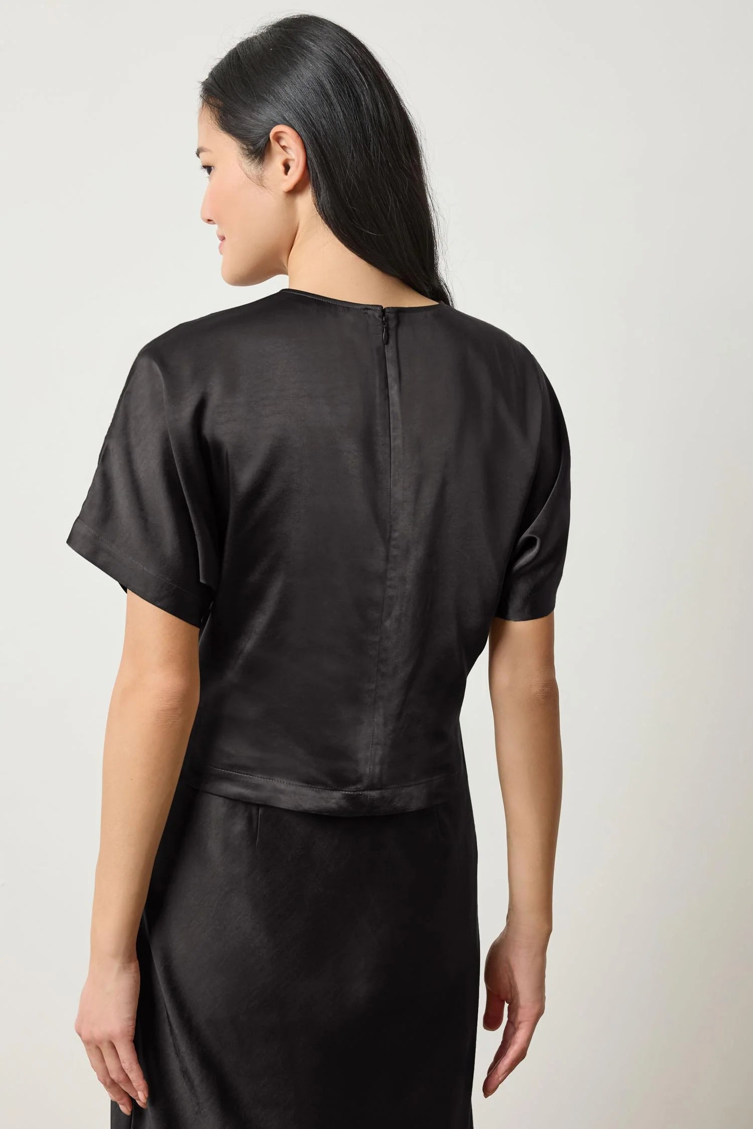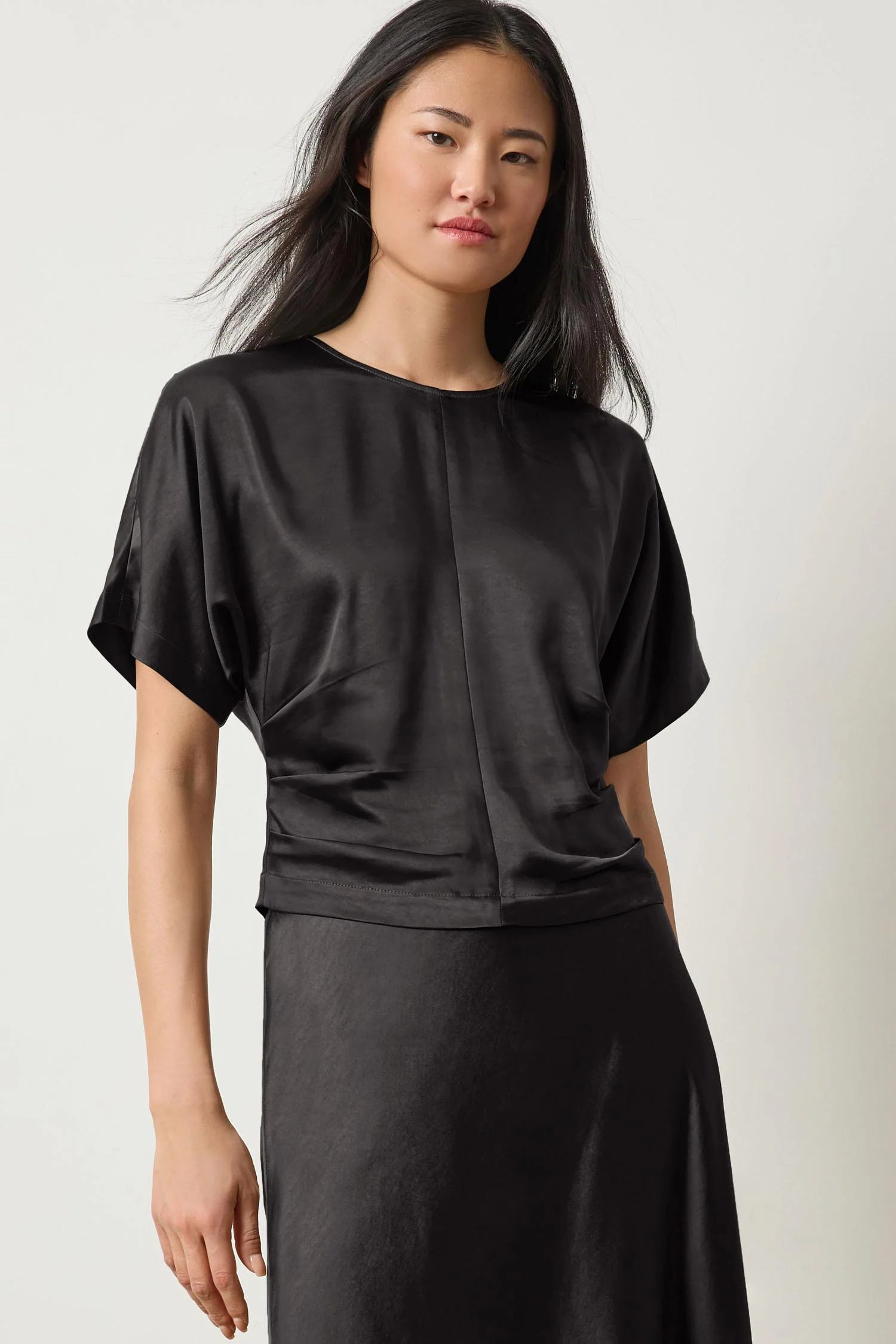 The Satin Dolman Short Sleeve in Satin Twill is a refined yet effortless staple. This simple crewneck top is designed with side pleats that subtly highlight the waistline, balancing the relaxed dolman sleeve shape. Pair it with the coordinating satin skirt for a polished head-to-toe look or style it with denim for an elevated yet casual outfit—perfect for an evening out on the town