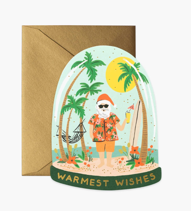 Santa deserves a vacation too! Share your warm wishes with this die-cut flat note shaped like a snow globe.